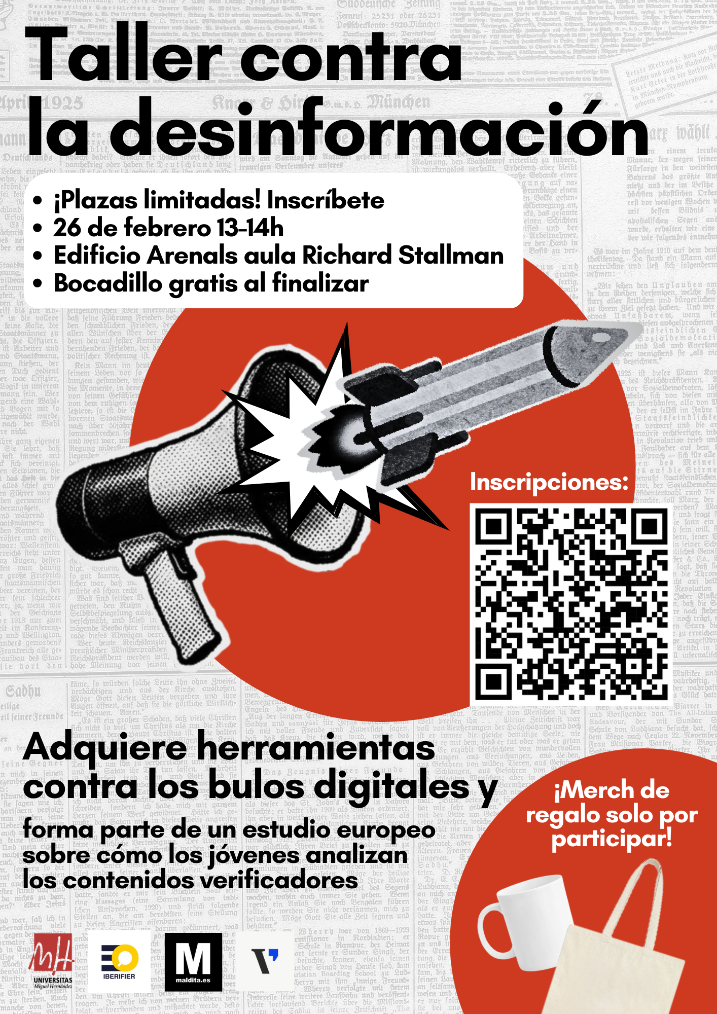 Desde Periodismo UMH y en el marco de un proyecto europeo de lucha contra la desinformación, hemos organizado un taller orientado a la verificación de contenidos informativos en el que también participan medios como Maldita, Newtral o Verificat. Consiste en una sesión de una hora en la que se darán pautas sobre la promoción del espíritu crítico ante los bulos a través de ejemplos prácticos.