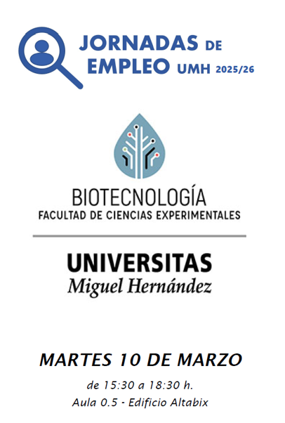 Os animamos a participar y aprovechar esta oportunidad para conocer de primera mano las distintas salidas profesionales que ofrece la Biotecnología y resolver vuestras dudas sobre el futuro laboral del grado.